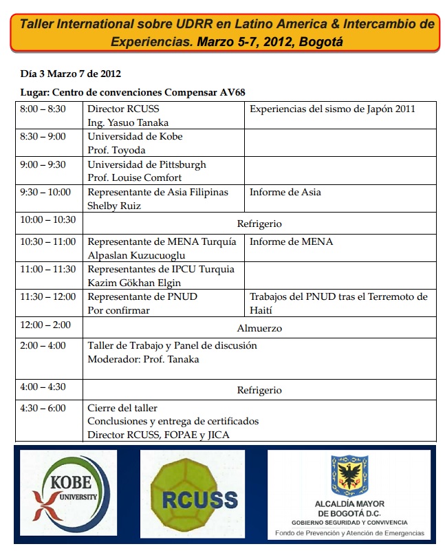 KUZUCUOĞLU A., KOBE UNIVERSITY RCUSS MENA GROUP DRR ACTIVITES, International Workshop on UDRR in Latin America & Information Sharing , Kobe University RCUSS, JICA, Colombia and Prevention Emergency Fund (FOPAE), Colombia, Bogota, 05-07 March 2012